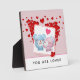 A photo plaque with editable text which says: You are loved. Designed with a cute cartoon image of a bear pair, one bear is pastel pink with a little bow and she is kissing the cheek of a blue bear who looks positively delighted. Very cute and kawaii. Lots of red hearts floating all around. Muted Pink background with a white polka dot pattern