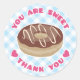 Doughnut thank you sticker reads "You Are Sweet" across the top and "Thank You" across the bottom. Design features a chocolate doughnut (or Chocolate doughnut) with blue gingham background and hot pink text with hearts. An extra sweet way to seal envelopes or party favours, these stickers are great for bake shop, doughnut, doughnut, or breakfast themed parties and businesses!