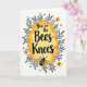 This greeting card features the phrase “You’re the Bees Knees” in flowing black lettering, centered inside a soft yellow, wavy shape with a deeper golden outline. Around the message, a loose wreath of grey-green leafy sprigs stretches outward, all drawn with simple black outlines. Small yellow flowers with six rounded petals are scattered through the leaves, ranging from tiny dots to slightly larger blooms. Beneath the words sits a cute bumblebee with black-and-yellow stripes and small white wings, as if it just landed there. The background is plain white, which makes the yellows and muted greens stand out without feeling busy. It feels like a sweet way to tell someone you admire them, with a little joke that still comes across as sincere 🥰. The message is easy to read and sits right in the middle, so your feelings come through clearly ❤️.