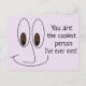 Are you looking for a fun postcard for a friend? How about this cool smiling cartoon face design postcard that also says: 'You are the coolest person I've ever met!' printed in cool black letters next to the cartoon face. Perfect to send one to all of your favourite friends!