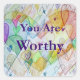 The decal stickers message notes, "You Are Worthy." The painting features overlapping hearts in a rainbow of colours. The heart images are drawn and painted in watercolor. A single large heart defines the border between the drawing and painting heart images. The art is a tribute to the community of love and friendship in our lives as it overlaps with the world.