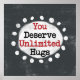 Bold text reading "You Deserve Unlimited Hugs" is centred against a grey background. The black text sits on a white circle with large textured white dots around it, providing a playful contrast against the solid colour backdrop.