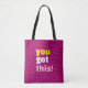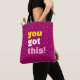 This stylish and inspiring tote bag features a vibrant fuchsia background with an eye-catching black spiral design that adds a sense of dynamic energy. A colourful, pop-art style message in bold, playful letters spells out "You Got This!", offering a daily dose of motivation wherever you go.