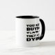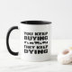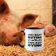 This "You Keep Buying, They Keep Dying" mug features a quote with black lettering and farm animals.
