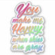 The sticker features a vibrant rainbow background, which serves as a colourful and uplifting backdrop for the quote, "you make me happy when skies are grey."