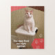An adorable photograph of a white and tan kitty cat sitting on top of a large food bin with the message "You may feed me right MEOW!"