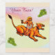 painting illustration, showing a bold young bacchus boy riding a crouching roaring lioness in front of a pastel colour background and two green grapes. The Bacchus boy symbolises Dionysus, the legendary god of wine, also represented by the goblet in the boy's hands as by the grapes.