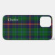 Stylish iPhone 12 case done in a colourful blue, green, yellow, and red traditional Scottish tartan plaid of the Young clan. White text running vertical, on the left side, is ready to personalise. Stylish and great way to protect your electronic device, and makes a great gift idea.