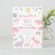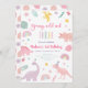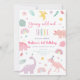 This adorable birthday invitation features hand drawn dinosaurs, rainbows and leaves in pastel colours.