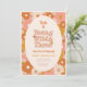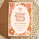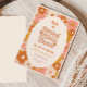 "Young, wild and three" groovy retro 3rd birthday invitation design features a pattern of whimsical wildflowers, in a bohemian colour palette of terracotta, beige, pink and yellow.