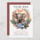 Young Wild Three 3rd Birthday Kids Cute Elephant Printable Instant Download Digital Invitation Invite Einvitation Evite features a cute and colourful watercolor baby elephant surrounded by tropical flowers with the text "Young, wild and three!" in modern typography script. Perfect for kids third birthday party celebrations. Send in the mail or simply download the shareable downloadable digital invitation. Designed by Evco Studio. For coordinating items view www.zazzle.com/store/evcostudio