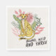 Add a fun safari touch to your child’s third birthday with this “Young, Wild and Three” cheetah napkin. Featuring a hand drawn cheetah surrounded by tropical leaves, this playful jungle design is perfect for wild themed parties and adventure loving little ones. A cute and modern detail for your party table.