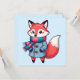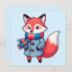 The image depicts a stylized and adorable fox dressed in a coat and scarf for the winter. The image shows a stylized red fox, drawn in a cartoon style. He has large expressive eyes and a cute snout. The fox is wearing a light blue coat, buttoned with large orange buttons. A red and navy blue striped scarf is tied around the neck, the ends of the scarf ending with fringes. Its tufted tail is red and white, with a prominent white tip. The style is cute and childish, with sharp contours and vibrant colors. The background is black, which highlights the colored fox. The general atmosphere is warm and pleasant, evoking a feeling of comfort and winter softness.