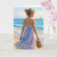 A woman in a striped sundress strolls along a sandy beach, holding her sandals in one hand, while waves gently lap at the shore.