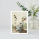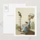 Young woman reading in a day dress with an elabora postcard