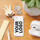 Cool white keychain features your company logo on the front and your business name, contact info, website, or other text on the back. Makes a great promotional giveaway for customers. Replace the sample logo and text with your own in the sidebar. Your logo can be any colour.