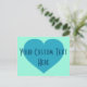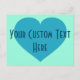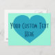 This postcard features a shapely turquoise heart on a light green background overlaid by a text template. Click "Customise it!" to re-size/re-position turquoise heart image, change background colour, and personalise text. Choose font, style, size, and colour. The reverse side of the card is blank, awaiting your personalised text or handwritten sentiments.