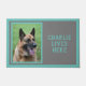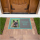 You can personalise this doormat by adding your dog's (or cat's) photo. Your pet's name can be added next to the photo. Both name and words can be personalised. The background is grey.