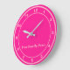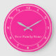 Pink round wall clock that you can personalize by typing your family name. You can also change your family name font style, font color and the background color in the design tool. Please check the appearance after typing your family name. If the appearance is pleasing to you, you can place your order now. If you need to resize or reposition your family name, please adjust in the design tool.