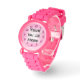 This custom watch template with semi-transparent rose-coloured numbers (20% sheer) adds a nice colour accent to your background image or photo. The drop shadows give the numbers in this flat printed timepiece an embossed, almost 3D look. This design goes especially well with pastel and girly-themed backgrounds. When paired with a colour-coordinated pink band as shown here, it makes a cool watch for kids and teens.
