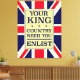 Your King and Country need you Enlist. World War propaganda poster with a united kingdom flag.