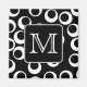 A black and white monogram design. This design features a black and white funky pattern of circle - ring type shapes. There is also a black and white square shape that has a custom monogram initial letter in the middle. The letter is white and can be personalised. This design has a fun retro look.