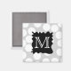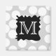 This design has a black splat shape and white monogram letter, on a pattern of white spots on light grey. The initial letter can be personalised. A fun monochrome design.
