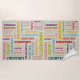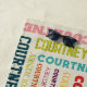 Create a very extremely personalised beach towel. Your custom name appears all over this towel in a collage of different fonts and lettering styles. Lettering in red, yellow, orange, lime green, turquoise, pink and purple is set against a light tan or cream coloured background.