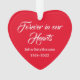 This beautiful heart memorial Christmas ornament is very special because it features your special memories of your loved one on the back. On the front the design says "Forever in our Hearts" with the name of your loved one and dates right below. On the back of the heart, are the words "We will always remember" and then you can customise the design with the three things your remember most about your loved one (be sure to make sure these items are short enough to fit on the heart). This personalised heart memorial ornament will help keep your loving memories alive this Christmas and always. Copyright sympaththankyou