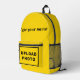 Yellow colour backpack that you can customise to put your name and photo. Please check the appearance after typing your name and uploading your photo. If the appearance is pleasing to you, you can place your order now. If you need to resize and move your name and photo to fit in the template or according to the appearance that you prefer, please change in the design tool. Examples of changes that you can make in the design tool are changing the background colour, font colour and font style. Personalise it. Have your name and photo on it. Backpack to conveniently carry your stuff anywhere. Backpack as camping bag.