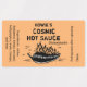 Use these custom labels for your bottles of homemade hot sauce or chilli pepper water. The template has a flaming chilli pepper in a faux woodcut or linocut style, like a vintage woodblock print, in black, on a pale peach background colour. The canning lables say, "Your Name's Cosmic Hot Sauce Homemade "