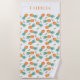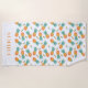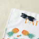 White beach towel with a trendy tropical pineappes fruits foodie pattern design and personalised name print at the top.