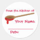 These personalised canning stickers will fit on top of your glass pickles and preserves jar lids. They have an image of a wooden spoon dripping some red sauce or jelly or jam.