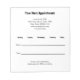 This notepad says "Your Next Appointment" at the top. Lines of black display text are available for the name of the dental office, street address, phone number, and website. There are also lines for the date and time of the appointment. The bottom has display text you can edit to show a custom message. All text can be edited or deleted.