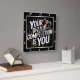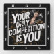 This black wall clock features the motivational text "YOUR ONLY COMPETITION IS YOU" in a bold white and orange outlined font with dynamic lines accentuating the words. A graphic of a muscular arm lifting a dumbbell is integrated into the design. The overall message encourages personal improvement and self-motivation in fitness.