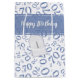 This design is a blue and white random number pattern with milestone number 70 repeated in varied sizes and angles in an all-over print. There is a blue band and a gift tag, printed on the front, with text templates so you can easily personalise the design.