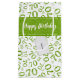 This design is a green and white random number pattern with milestone number 70 repeated in varied sizes and angles in an all-over print. There is a green band and a gift tag, printed on the front, with text templates so you can easily personalise the design.