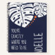 This design features the quote "You're Exactly Where You Need to Be", monstera tropical leaves on a navy blue background, and your name.