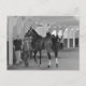 Black and white photo of a thoroughbred being led into the most historic paddock stalls where champions are saddled. Beautiful Belmont Park, home of the Triple Crown in Elmont New York, since 1905.
