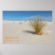 The image captures a serene landscape of White Sands National Park, featuring undulating white sand dunes under a clear blue sky. Several yucca plants dot the landscape, adding subtle colour and texture.