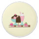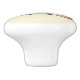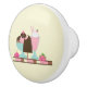 A ceramic knob with a sweet ice cream theme. Illustrated with a chocolate ice cream bar, 3-scoop sundae with a cherry on top, and a strawberry float with whipped cream. Little strawberries and cherries. Pale yellow background. Refreshing, hot summer treats.