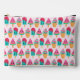 Toiletry bag with an illustration of 3 different ice cream treats. A blue-green popsicle with strawberry drippings and colourful sprinkles. A watermelon popsicle. A cone with layers of delicious ice cream in pink and mint. All with cute kawaii smiles.