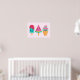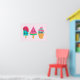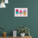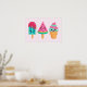 Poster with an illustration of 3 different ice cream treats. A blue-green popsicle with strawberry drippings and colourful sprinkles. A watermelon popsicle. A cone with layers of delicious ice cream in pink and mint. All with cute kawaii smiles.