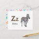 "Letter Z is for Zebra" in our Alphabet Flash Card set. Get all 26 letters of the alphabet! A double-sided postcard that is great for memory games and teaching, geared for education, schools, teachers and homeschoolers for kindergarten and babies. All text is editable if you need to customise.