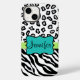 Zebra stripes and cheetah skins in black and white and lime green combine for graphic design for your cell case that can be personalised with your name. This is one of the hottest art and design trends, and is extremely popular from fashion to home decor. This sophisticated whimsy black and white, grey and lime green and white zebra and cheetah print collection is one of several colour combinations available. A turquoise teal blue emblem creates a personalisation area. This is fully customisable to personalise to include your name, monogram initials, business name or other words to convey your message. Go wild with these wild skins designs!