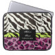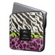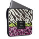 This wild and fun leopard print computer case sleeve art is new and contemporary. Featuring stylised, hand watercolored zebra and leopard print art which was hand painted. The top print is a white and black Zebra stripe, with lime green and black narrower ribbon and a bottom pattern of hot pink leopard print. Your name goes in the black tag in the centre of the design. There are several colours of leopard print and zebra print available. Your name or names personalise the case. There are also I-Phone and I-Pad cases to match. If we don't have the case you're looking for just email us and we'll make it for you.