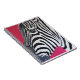 A notebook with a zebra design on it with a lovely pink background and on it is a zebra.