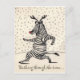 Zebra impersonating a reindeer with fake antlers and a red nose and ?Dashing through the snow" on the front.