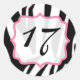 A sticker featuring a background of zebra print. Personalise the numerals inside pink frame with you age. Look for matching invitations at Jill's Paperie.