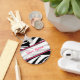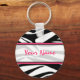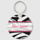 A keychain featuring a black and white zebra print background and hot pink trim. Personalise with your name over sheer centre section.